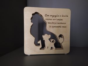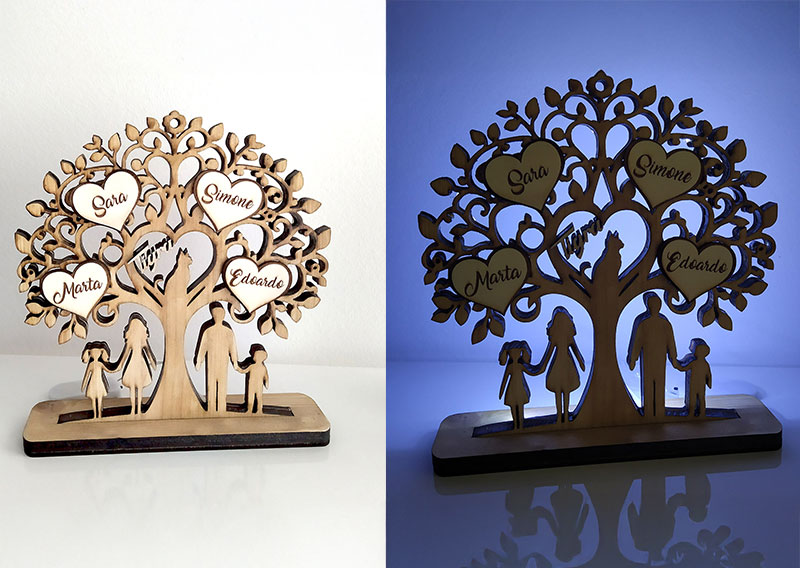 Lampada sagomata a forma di albero della vita. Queste lampade sono principalmente tagliate al laser per via dei loro dettagli complessi e realizzate in compensato. Su ogni albero è possibile inserire sagome aggiuntive di animali, persone e nomi.