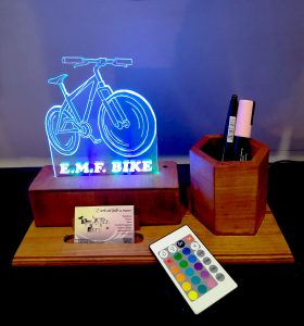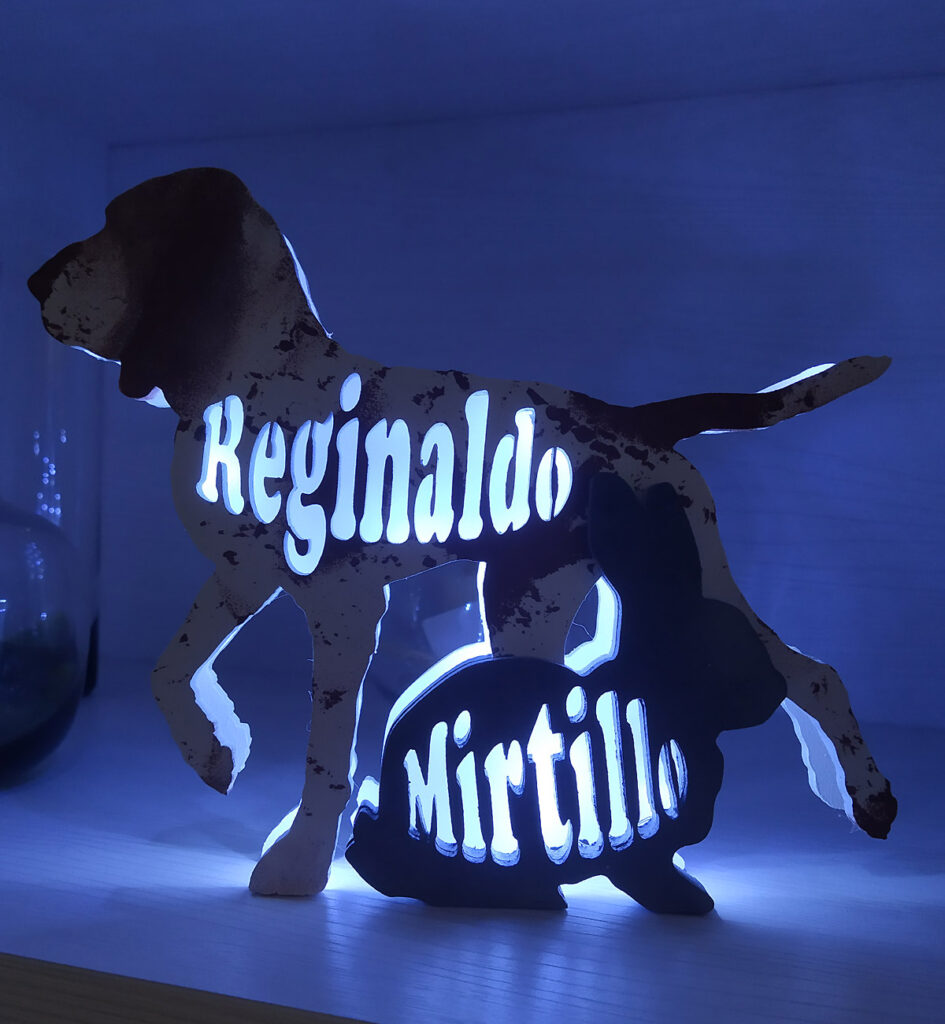 In questo tipo di lampada è presente una basetta di legno in cui viene inserito un vetrino di plexiglass ritagliato e inciso a mano il quale, una volta illuminato dai LED sottostanti, farà risaltare in disegno al buio.