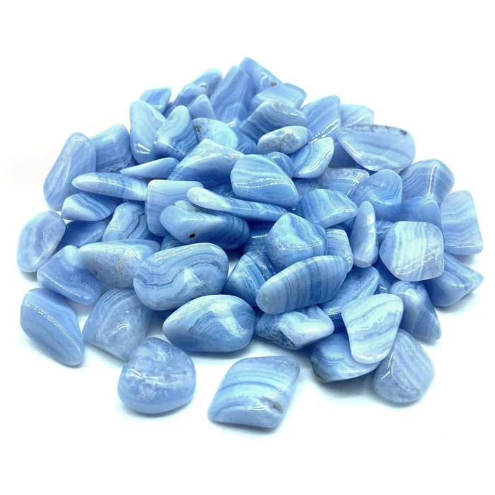 Infatti, nella cristalloterapia, il calcedonio azzurro è considerato una delle pietre che aiutano ogni aspetto della comunicazione: quindi la capacità di ascoltare e di capire, e quella di farsi capire a propria volta. Inoltre è ritenuto un amuleto scaccia paure, indispensabile per i viaggiatori, e gli studenti. Rafforza la memoria, e si ritiene possa aiutare negli esami, e nei colloqui.