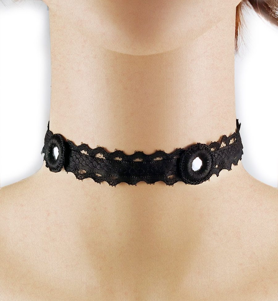 Collarino con bottoni, in pizzo nero traforato e ondulato sulle estremità, e nastrino di raso centrale ricamato con un motivo a nido d’ape. Il collarino è contornato da 6 bottoni neri ricamati, leggermente specchianti, che funzionano anche da punto luce.