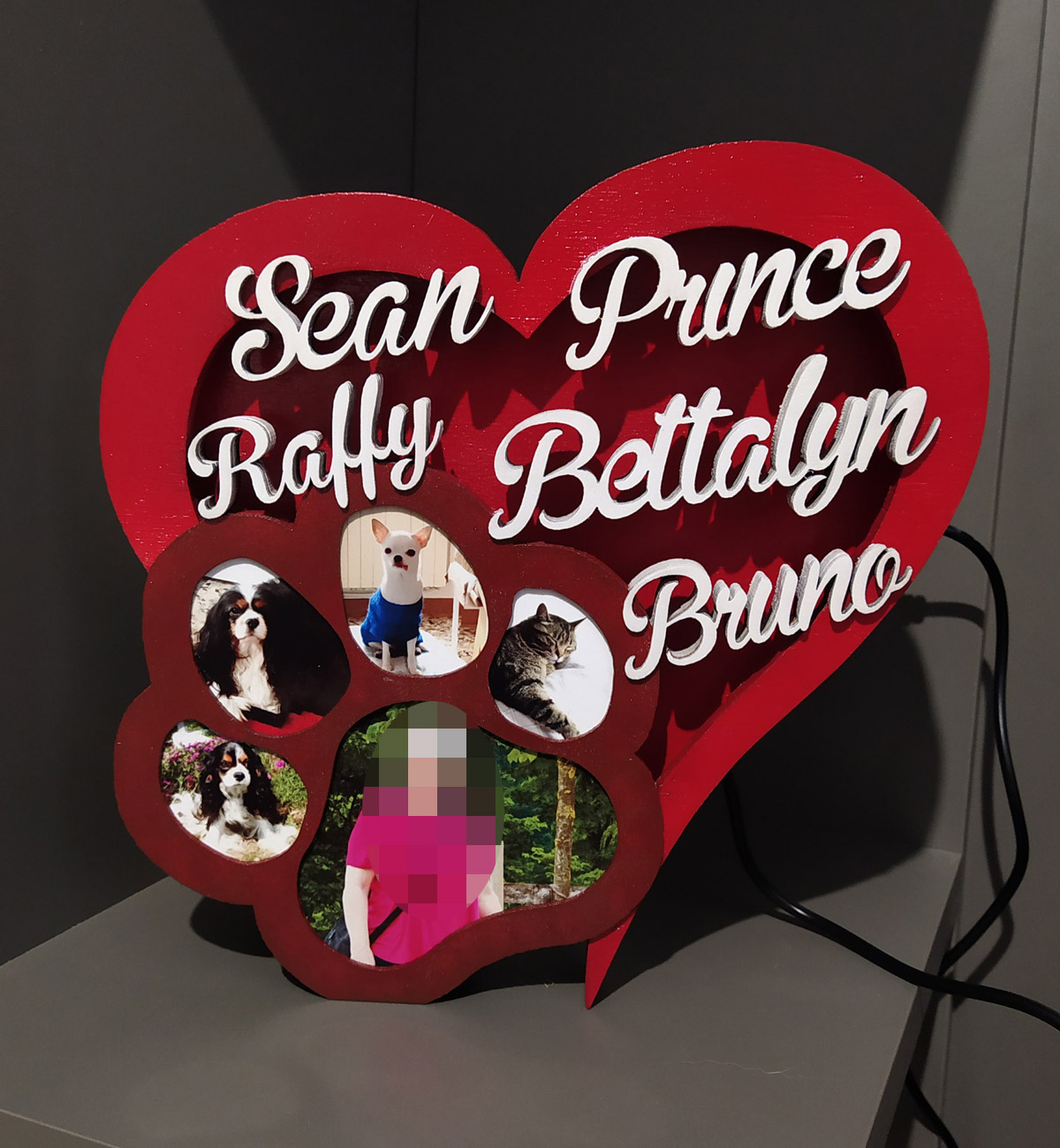 Lampada a forma di cuore e zampa, tagliata al laser e a mano, con nomi in rilievo e foto a scelta.