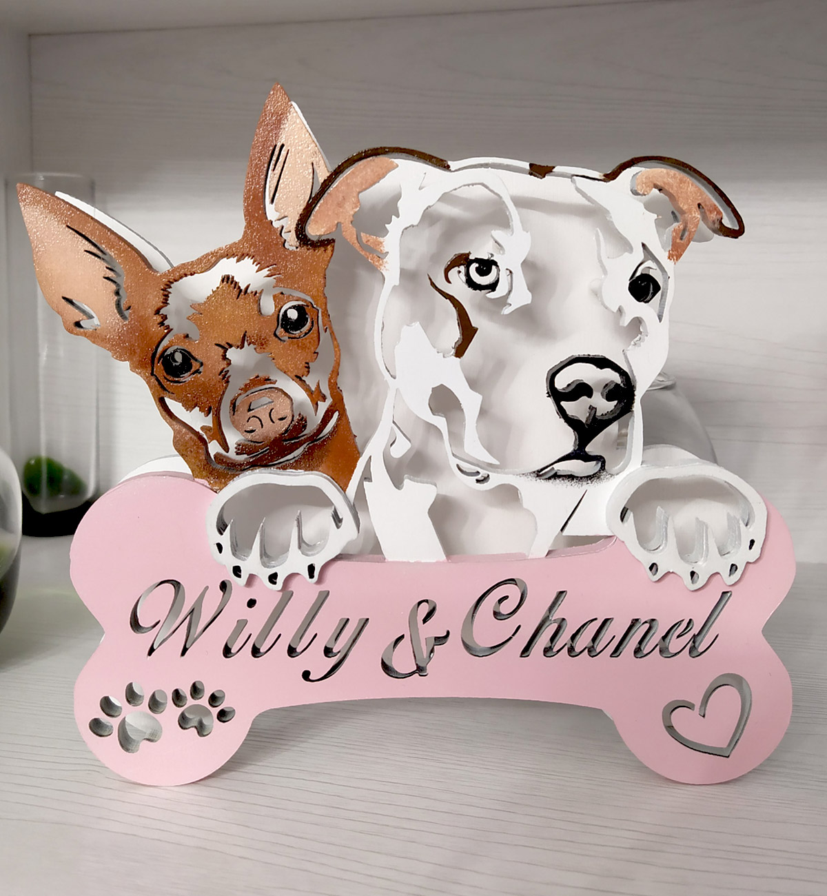 Lampada a forma di cane Pitbull e un Pinscher. Per questa lampada in particolare ho riprodotto, su richiesta del cliente, solamente il muso in formato stencil, utiilizzando poi come base di appoggio un osso in cui ho intagliato il nome dei cani.