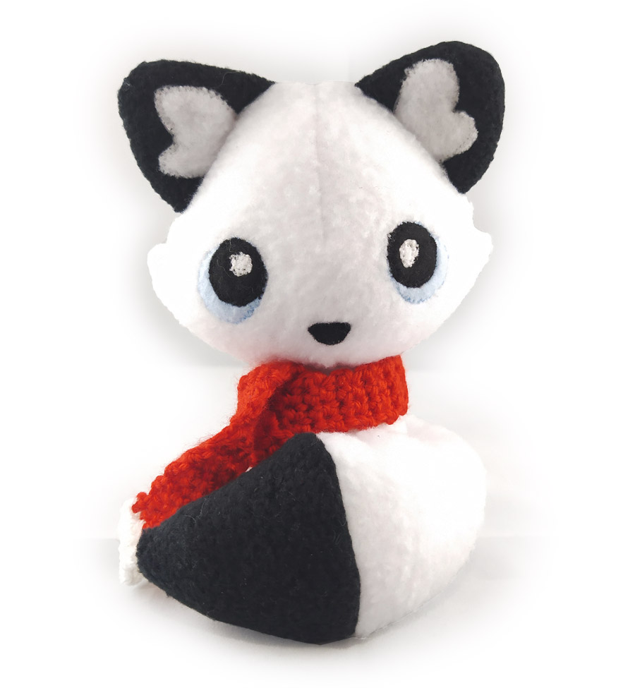 Piccolo peluche di una volpe bianca con punta delle orecchie, e coda, nere. Realizzata a mano in pile anti-pilling.
