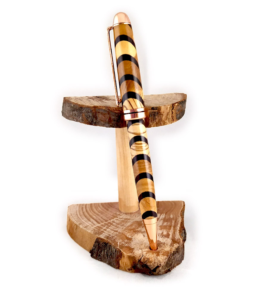 Motivo a onde a spina di pesce: nella zona con il legno più sottile e scuro ho utilizzato il Pau, mentre il resto della penna è in legno di ulivo, ben distinguibile per le sue bellissime venature e dal colore tendente al giallo.