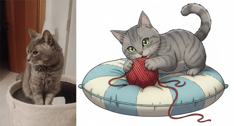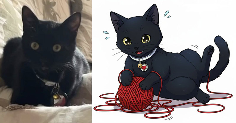 Ecco un esempio di come la foto del tuo gatto verrà trasformata in disegno, cercando di mantenere tutti i dettagli caratteristici dell’animale.