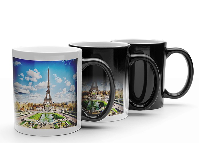 A temperatura ambiente, la tazza appare di un colore scuro, opaco e uniforme, ma versando una bevanda calda, il calore rende il rivestimento trasparente, svelando come per magia l’immagine nascosta.